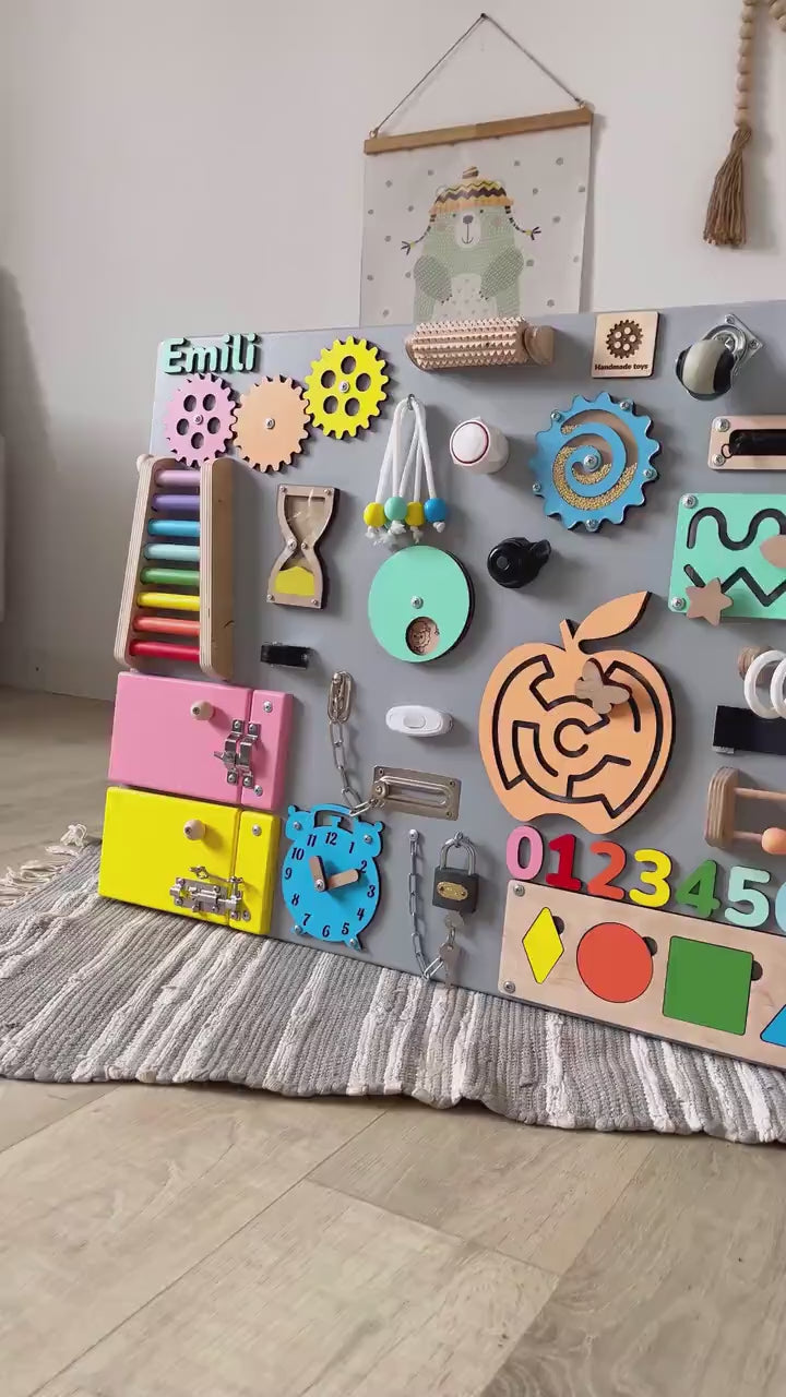 Busy board is made for ages from 1 years old. Can be mounted to the wall.